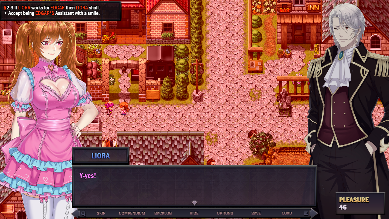 Once her Submissiveness is high enough, she must pass an SKA-style willpower check against her Lewdness or she will succumb to Edgar's advances. Submissiveness is currently gained by doing submissive Lewdness actions with Lewdness >= 11. Currently that is exactly the Handjob event with at least 1 clause to increase its Lewdness. So right, triggering this mechanic is not very easy but it will provide the future mechanical foundation for changing events of lower lewdness by having Liora give in to Edgar without needing clauses as a building block to reflect her lewdness progression.