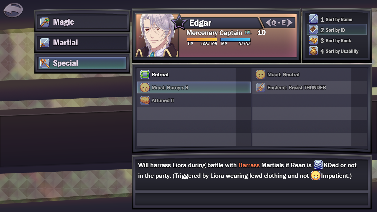 Those who downloaded a build mid-week may have already seen this as I deployed this feature along with some bugfixes. If you are wearing a lewd clothing, Edgar will gain the Mood "Horny". This mood is conceptually similar to the Cunning mood where he targets Rean with Cunning Martials, except here he targets Liora with Harrass Martials. These currently include Grope: Ass and Grope: Breasts.
