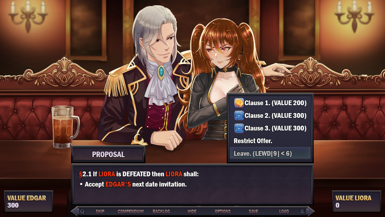 Then, the drinking module of the date event has also been expanded - you can now perform an extra negotiation if Liora is drunk and fitting proposals are available. This effectively restores the lost opportunity to negotiate with Edgar but Liora will be at a disadventage. The Drunk passive now hits Willpower, gives Temporary Lewdness and doubles Liora's perception of her own clause value; making her think an offer is better than it is... And if Willpower is too low, she can't reject it. Well, you see where this is going.