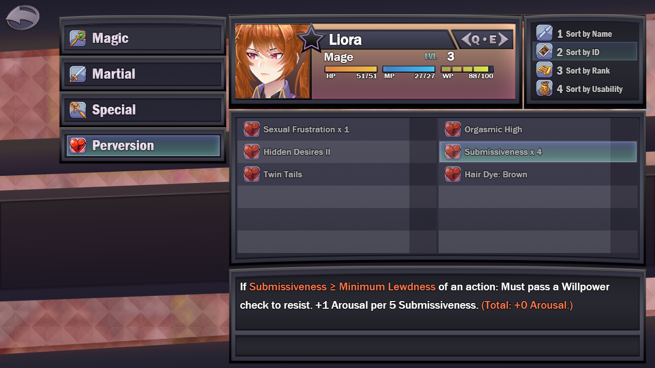 We have also new perversion passives to reflect the new lewdness heights Liora can reach through her sexual service activites: The most impactful one being "Submissiveness x X". It's a passive with its own stat number X and models Liora's general ability to fail to resist Edgar's advances. If Liora becomes subject to certain actions (like Edgar groping her during her date with him), this passive now provides a second way for her to become unable to shake him off, besides using a clause.