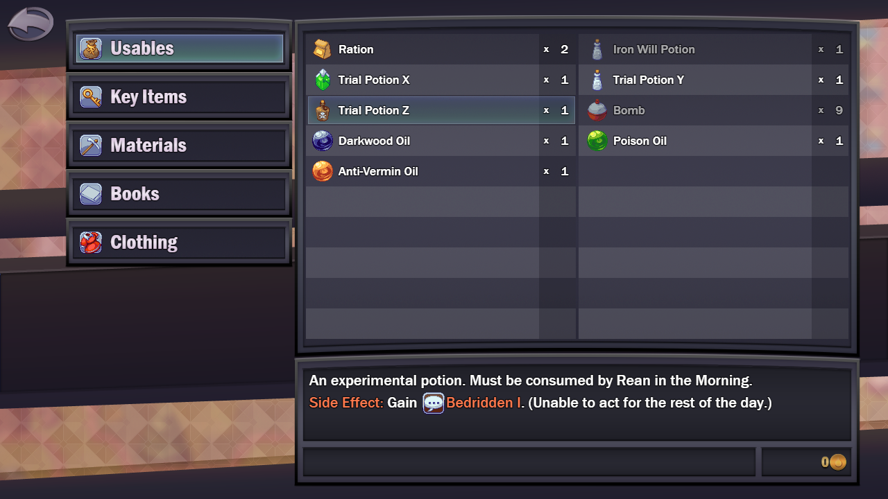 But more importantly, this is also the first instance where Rean can be out of the party. One of the potions (Trial Potion Z) gives Rean the Bedridden passive which I intend to later use as one of the main mechanics during Decay progression to put Rean out of the party. The quest also has an objective where the healer needs to study Rean, also putting him out of the party for the quest purpose. I used this quest to develop the necessary logic so all the other events work with Rean unavailable (to this degree). For Bedridden I and II, I will still need to expand the logic a bit further.