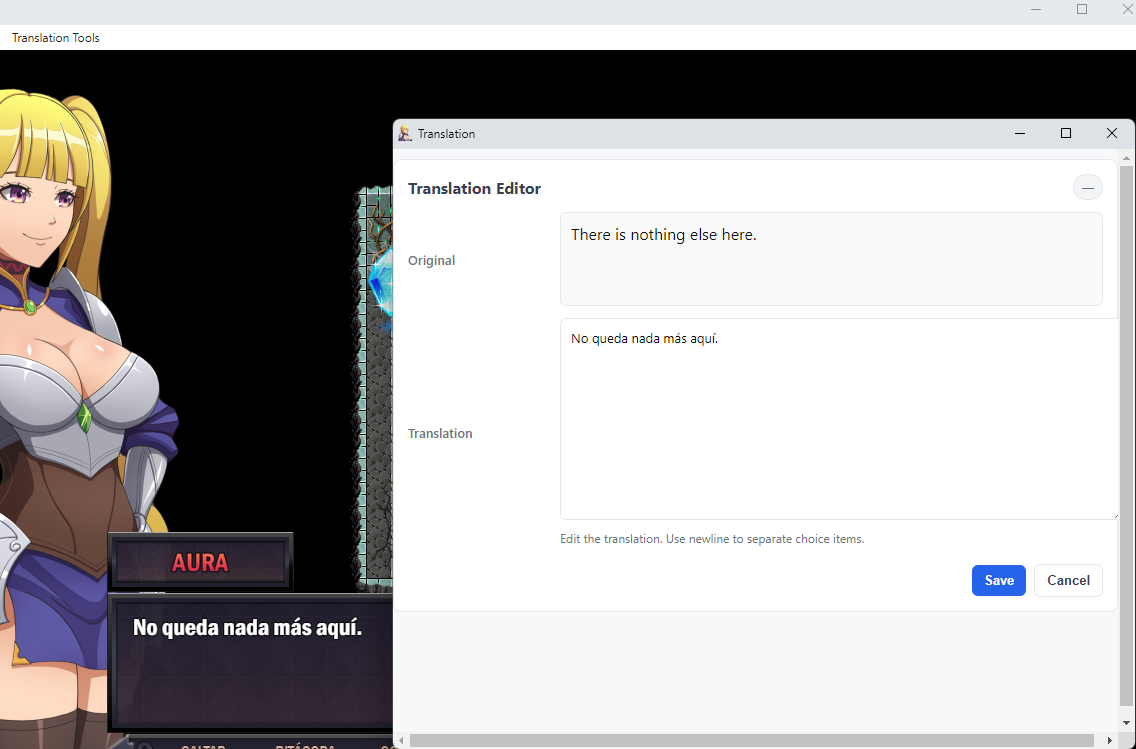 On the side of our assistant developer Trihan, we have some progress on the translation support side. We added a new mod (by default disabled, needs to be enabled by setting enabled to true in the translation-tools/META.json) that allows in-game editing of various texts. I hope that this will help our translators.